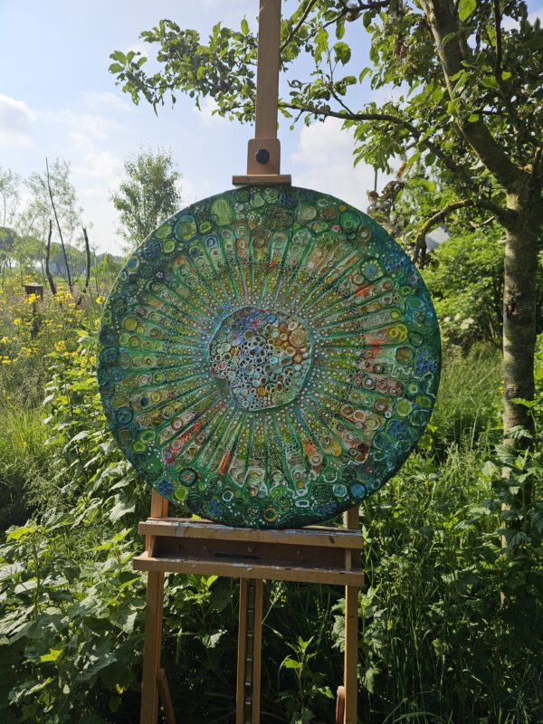 Tentoongesteld op Porrestoen 2024, met als idee erachter de wereld onder onze voeten. Hoe ziet schoonheid eruit die we niet kunnen zien? Cellul’Arte is een microscopische dwarsdoorsnede van een Hydrangea. Gemaakt van Klei en Acryl, gemonteerd op een hardhouten frame.