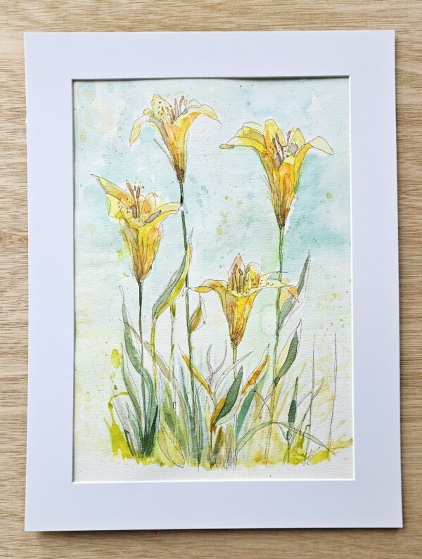 Delicate aquarel van een groep bloeiende lelies buiten in de zon.